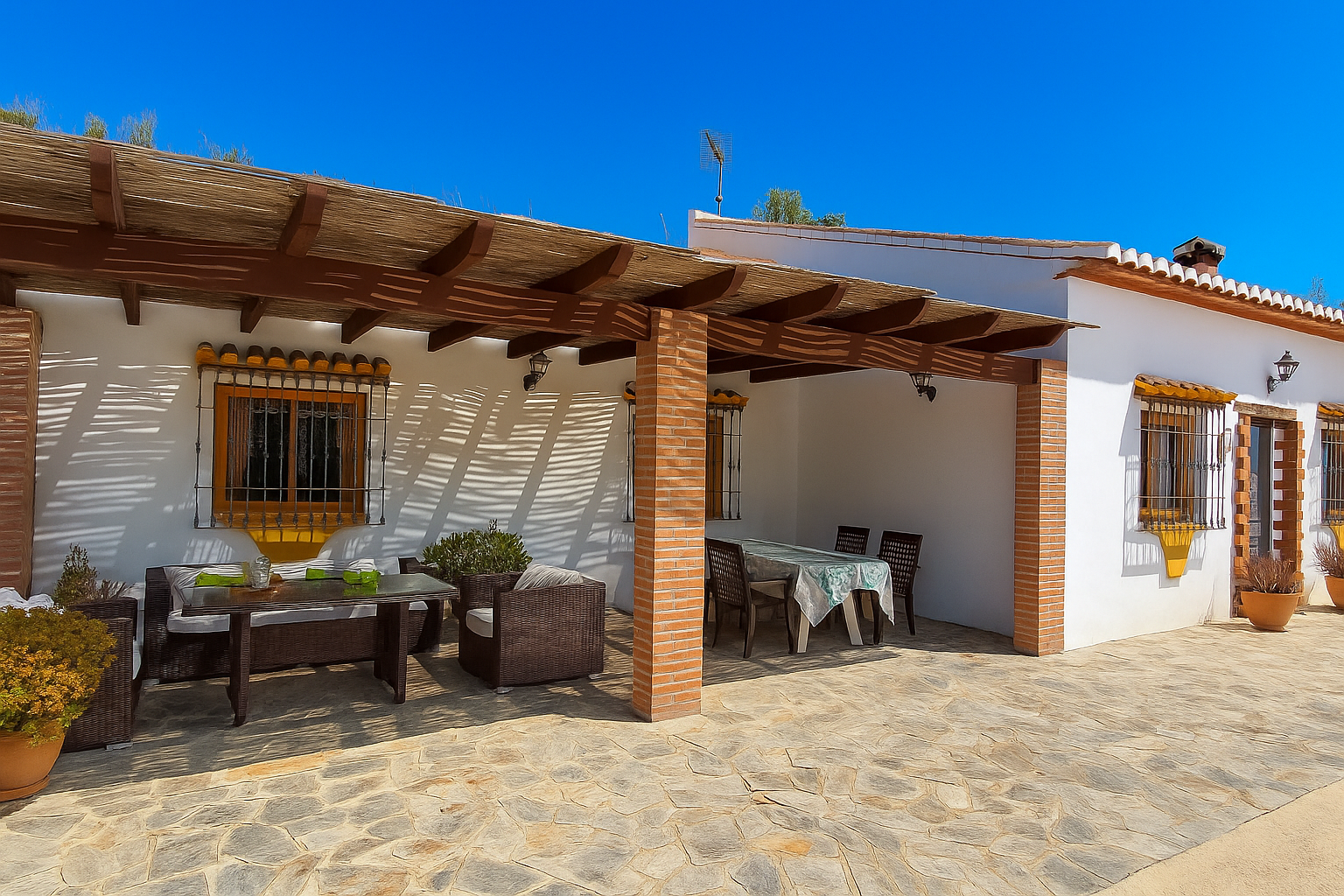 Built in classic Mediterranean finca style, it combines rustic charm with timeless architecture. Outside, a generous pool (9x5 m, 1.30–1.90 m deep) basks in sun from dawn to dusk, with loungers, a shaded pergola for meals, and terraces overlooking the mountains—ideal for long lunches or sunset drinks.